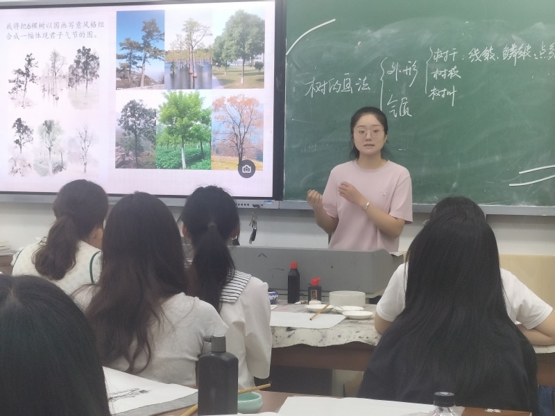 随后,孙老师通过视频展示南通市的树,引导学生思考树的组成与气质特点。其中,先请学生自主探究树干表现方法,孙老师在点评学生作业强调画树干时需注意的组织结构和质感表现,随即引出树干的不同皴法以及“树分四岐”的要点。接着通过不同树种图片的对比,介绍了树枝、树叶画法。为了让学生更直观地理解树的画法,孙老师进行了课堂示范,边示范边讲解树的画法要点。示范完成后,引导学生回到创设的情境中去,运用本课学习的知识指出实习生小伟通过AI生成的作品中不合理的地方。并在课堂上操作AI,通过AI生成的“以国画写意风格生成的六棵树,体现君子气节”图片与倪瓒的《六君子图》对比,总结升华AI是理性产物,而艺术需要感性,需要主观能动性,因此不能依赖AI完成创作。国画艺术强调以形写神,在刻画树的同时也在刻画画家自己,体现了荒寒冷峻的山水美学。最后,孙老师也提醒同学们在专业课学习中,应当有扎实基本功,为今后走进小学课堂打下坚实基础。