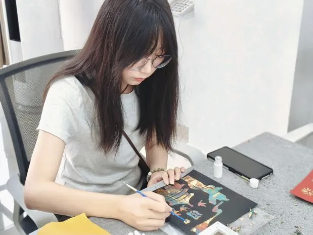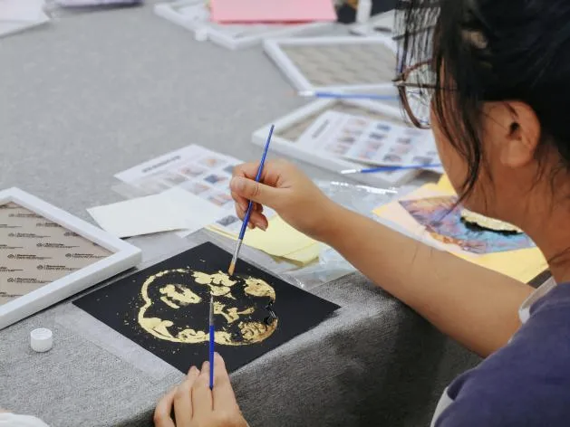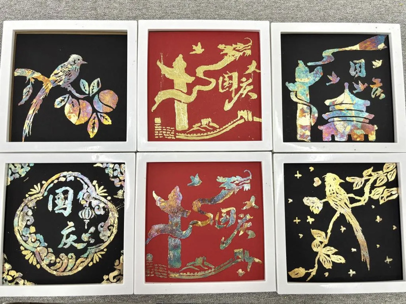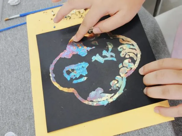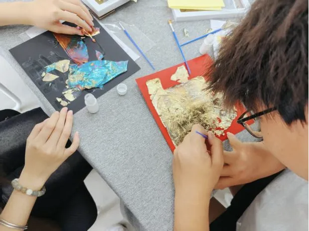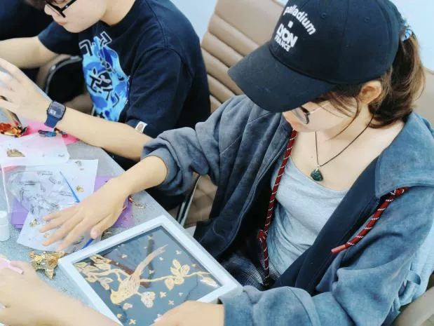 金箔技艺,是一项历史悠久的非物质文化遗产,它以金为材,经千锤百炼而成薄如蝉翼的箔片,蕴含着“真金不怕火炼”的匠心精神。活动现场,同学们对这项传统技艺展现出浓厚兴趣。参加活动的同学们相互交流、自主探索,从设计勾勒国庆主题图稿,到小心翼翼地为图案涂抹胶水,再到专注地将一片片璀璨的金箔粘贴、按压……整个过程充满了尝试与发现的乐趣。