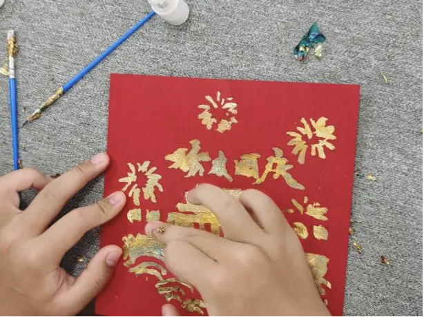 尤为关键的一步是“烧箔”,同学们利用工具对箔片进行灼烧处理,使其产生丰富而独特的肌理与色彩变化。这一过程仿佛赋予了作品灵魂,当金色的光芒与象征喜庆的中国红相互映衬,一幅幅独具匠心的作品逐渐诞生,凝聚着大家对祖国生日的诚挚祝福。