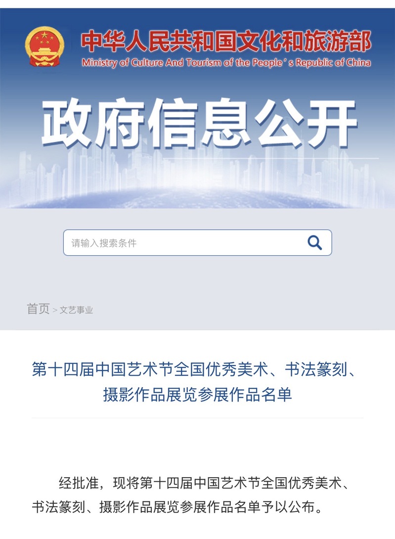 近日,由文化和旅游部、重庆市人民政府、四川省人民政府、中国美术家协会共同主办的第十四届中国艺术节隆重开幕。我院教师、南通市美术家协会会员高广毅的油画作品 《源初·5》 ,经层层遴选,成功入选第十四届中国艺术节全国优秀美术作品展览。