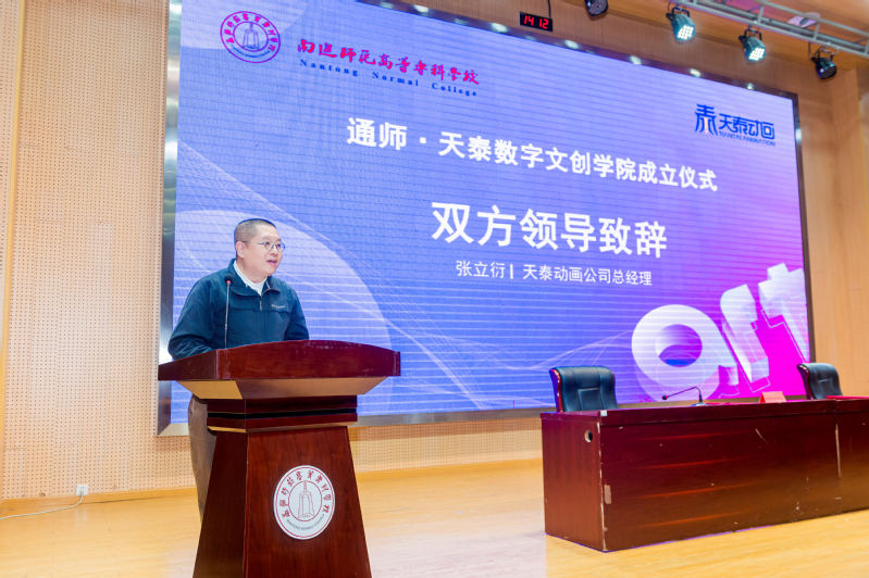 仪式上,主持人代为宣读了中国文化艺术发展促进会动画专业委员会高峰主任发来的贺信。贺信中写道:“相信在贵校深厚积淀的滋养下,在天泰动画团队的创作赋能下,这座产业学院定能成为校企协同育人的标杆,为南通文化创意产业发展注入新动能。”