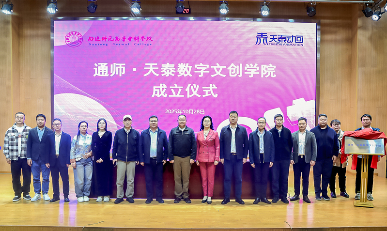 江海之畔秋意浓,金风送爽喜迎宾。2025年10月28日下午,“通师·天泰数字文创学院”成立仪式在南通师范高等专科学校隆重举行。学校党委书记陈玉君、校长岳峰等校领导,天泰动画设计有限公司负责人张立衍,南通市委宣传部及市动漫协会、多家企业代表出席仪式,共同见证这一校企共建平台正式启航。