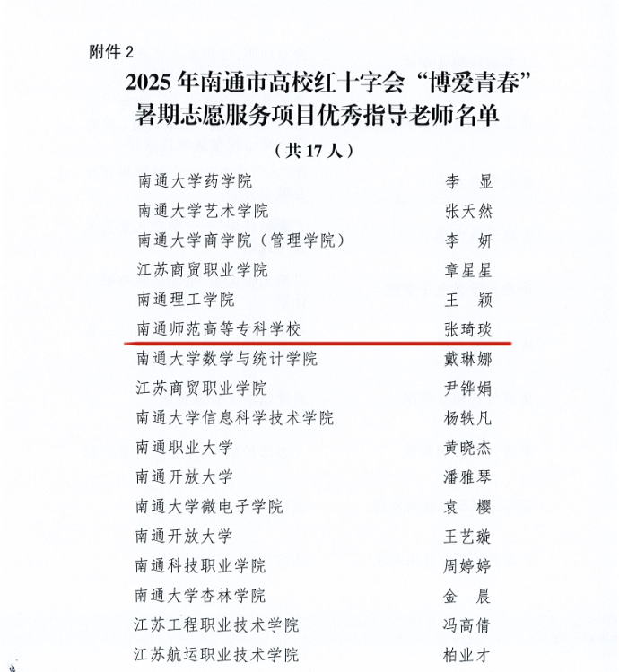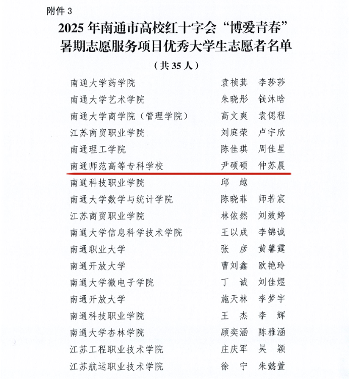近日,南通市委社会工作部、市教育局、市卫健委、团市委、市红十字会联合公布2025年全市高校红十字会“博爱青春”志愿服务项目评选结果。我院“星星‘益’站启星逐光志愿团”凭借扎实的服务成效与广泛的社会影响,成功获评市级一类项目,张琦琰老师荣获优秀指导老师,尹硕硕、仲苏晨荣获优秀大学生志愿者。