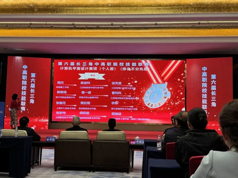 2025年10月26日,第六届长三角中高职院校职业技能联赛在安徽省安庆职业技术学院盛大举行。我院郁婉婷老师指导的侯苏涵、付紫萱两位同学,凭借出色的专业能力与稳定的现场发挥,在“计算机平面设计”赛项中脱颖而出,分获一等奖与三等奖,为学校赢得荣誉!