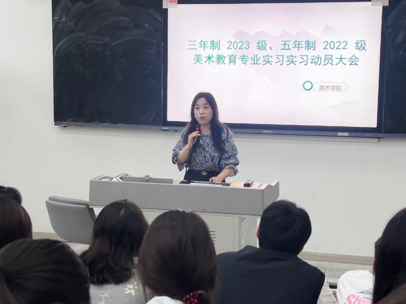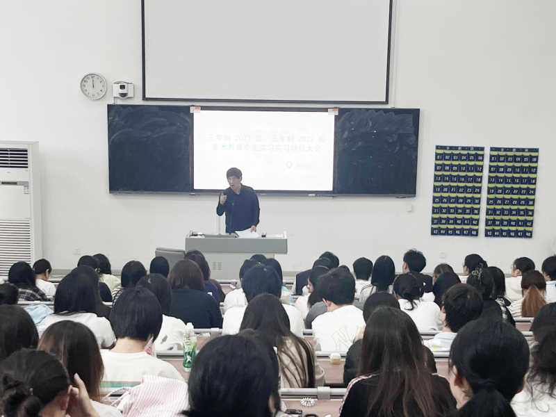 为全面部署三年制2023级与五年制2022级美术教育专业教育实习工作,帮助学生明确目标、强化安全意识,2025年10月15日下午,美术学院于国秀楼阶梯教室隆重召开实习动员大会。学院领导班子、美术教育系主任、各实习班级辅导员及全体实习生共同参会,会议由美术学院副院长王人佼主持。