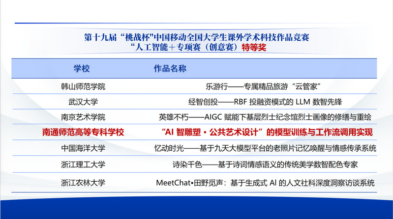 2025年10月31日至11月4日,第十九届“挑战杯”全国大学生课外学术科技作品竞赛总决赛在南京大学圆满落幕。该赛事由共青团中央、中国科协、教育部、中国社会科学院、全国学联及江苏省人民政府联合主办,是国内大学生学术科技领域的顶级赛事之一。赛事共吸引来自全国2700多所高校的40余万件作品、300多万名学生参赛。由我院郁献军、朱敏、王人佼指导的参赛项目《“AI智雕塑·公共艺术设计”的模型训练与工作流调用实现》,凭借前沿的创新设计与过硬的技术能力,从众多高校中脱颖而出,一举斩获人工智能+”专项赛(创意赛)全国特等奖。