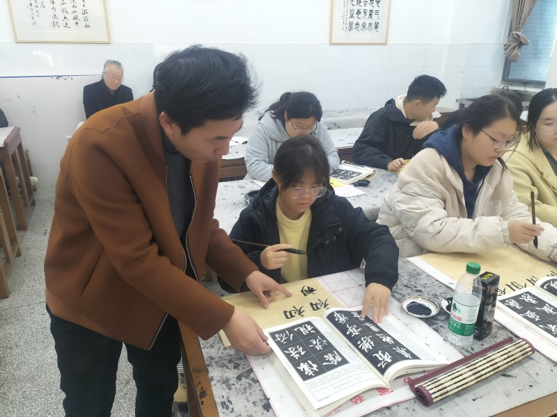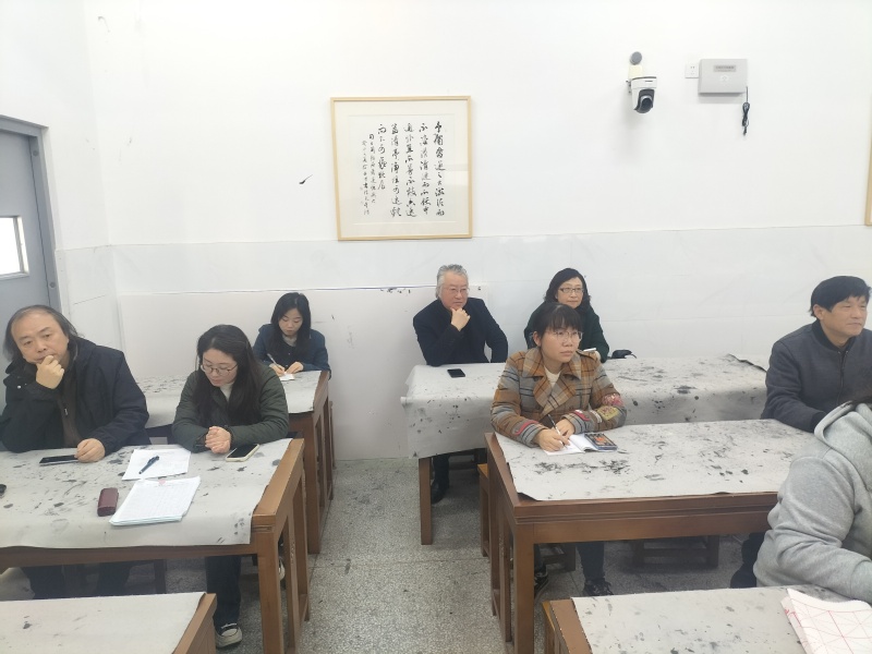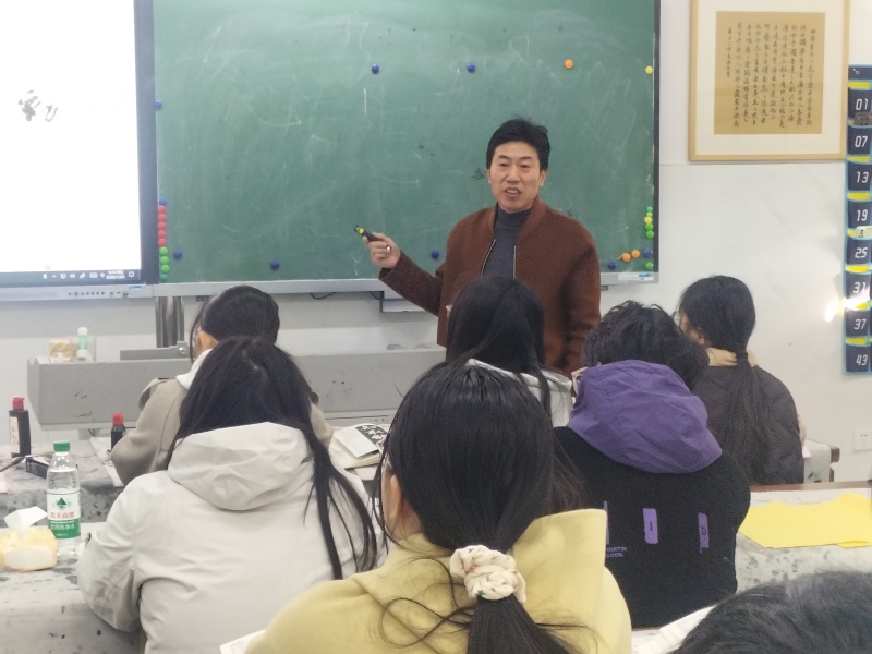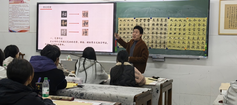 2025年11月21日上午第一节课,美术教育系“每月一课”教研活动在国秀楼114书法教室如期举行。本次开展教研活动的是美术教育24(1)班的书法篆刻课程,由曹银虎老师主讲,以“和而不同——《兰亭序》左右结构特征和规律研究”为主题,通过创新教学设计与文化浸润,为师生呈现了一堂兼具艺术性与思想性的书法美育实践课。校教学督导刘燕妮教授、朱敏院长、王人佼副院长、系部负责人沈如春主任及部分美术教育系老师一起参加了听评课。 本课鲜明特色首先在于教学设计的创新。课程以解码千年书法的“和而不同”为核心理念,通过三大教学模块层层递进。在导入环节,曹银虎老师精选《兰亭序》中典型左右结构字,与欧阳询楷书进行对比,引导学生发现行书特有的“动态平衡”之美。小组合作探究环节,学生通过观察“相”和“时”等字例,自主总结出“比例错落、笔势呼应、避让穿插”三大特征,课堂气氛活跃。示范教学中,曹老师一边演示一边讲解笔势的轻重缓急以及笔画俯仰向背的笔法要领,笔锋转折间尽显“中和之美”。 其次是美育特色的彰显。课程创新构建“三维美育矩阵”,三维目标深度融合。知识维度,学生系统掌握左右结构“呼应、避让、疏密、欹侧”四大规律;能力维度,通过临摹实践,将理论转化为艺术表达能力;价值维度,深度挖掘“和而不同”的文化哲学内涵,将书法艺术与社会主义核心价值观有机联结。学生在临习时,自发探讨“和谐共生”的传统智慧,实现美育与德育的自然融合。 课后,参与听课的领导老师集中在小学美术教育研究所办公室进行了评课活动。他们对本课给予了高度评价,认为这是一堂充满书法艺术与美育大融合的优质公开课,具有一定的教学研究深度,创新的教学设计将思政元素自然融入每个教学环节,起到了因势利导的作用,达到了良好的教学效果。这堂别开生面的书法课,既是美术学院美育改革的缩影,更是传统文化创造性转化的生动实践。当“天下第一行书”遇上新时代美育理念,迸发出的不仅是笔墨之美,更是文化自信的力量。