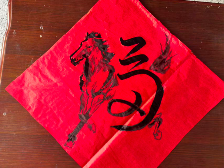 这幅福字尝试以书入画、融画于书,将骏马奔姿与书法笔意相融。朱红为底,浓墨塑福字骨架,淡墨晕染骏马鬃毛,墨色浓淡相生,红墨相映成趣。借字寄意,愿新岁如骏马,驰骋天地无羁绊,落笔成愿,岁岁平安,前程似锦。