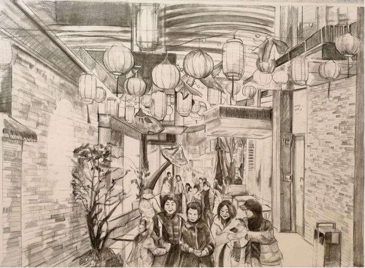 这幅作品以素描定格徐州文庙的新春景致,留住老家新年的红火年味与烟火气息。离家两三年未归乡过年,便想以画笔为桥,在画中赴一场家乡的新春之约。虽画面尚有不足,但已尽心描摹街景细节,勾勒独属于徐州的节日氛围。