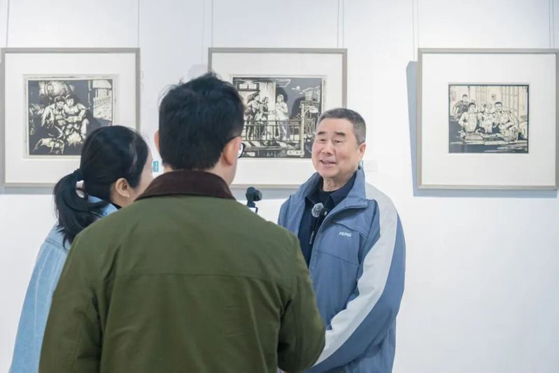 仪式结束后,与会嘉宾在工作人员的引导下移步美术馆,现场观摩“先生归来——沈行恬‘画画的那些事儿’”图文展。沈行恬先生在展厅与大家亲切交流,分享画作背后的故事。